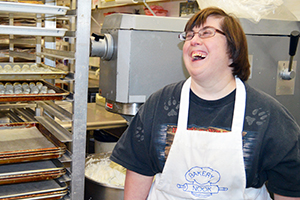 Jodi began working at The Bakery Nook in 2006 four days a week with the support of a job coach. Her daily tasks include hand washing the industrial baking equipment, assisting bakers with food preparation by putting muffing batter into muffin pan tins, helping fold dessert boxes for pick-up and delivery, and helping keep the kitchen clean. Jodi performs all of these tasks seamlessly thanks to her attention to detail, hardworking nature, and people skills.